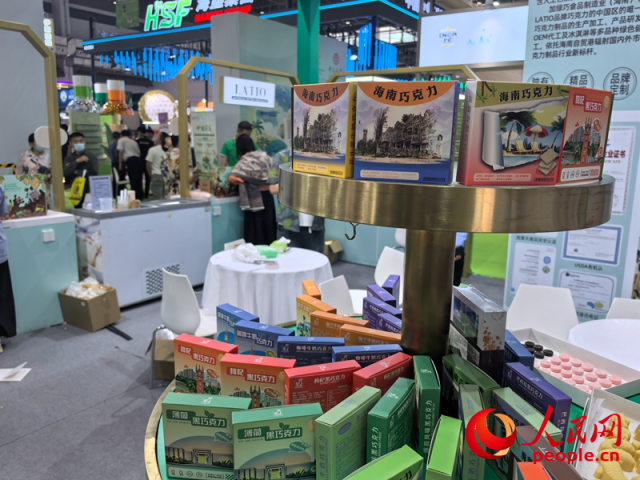 进口原料加海南辅料生产的巧克力伴手礼在消博会展示。人民网记者 毛雷摄